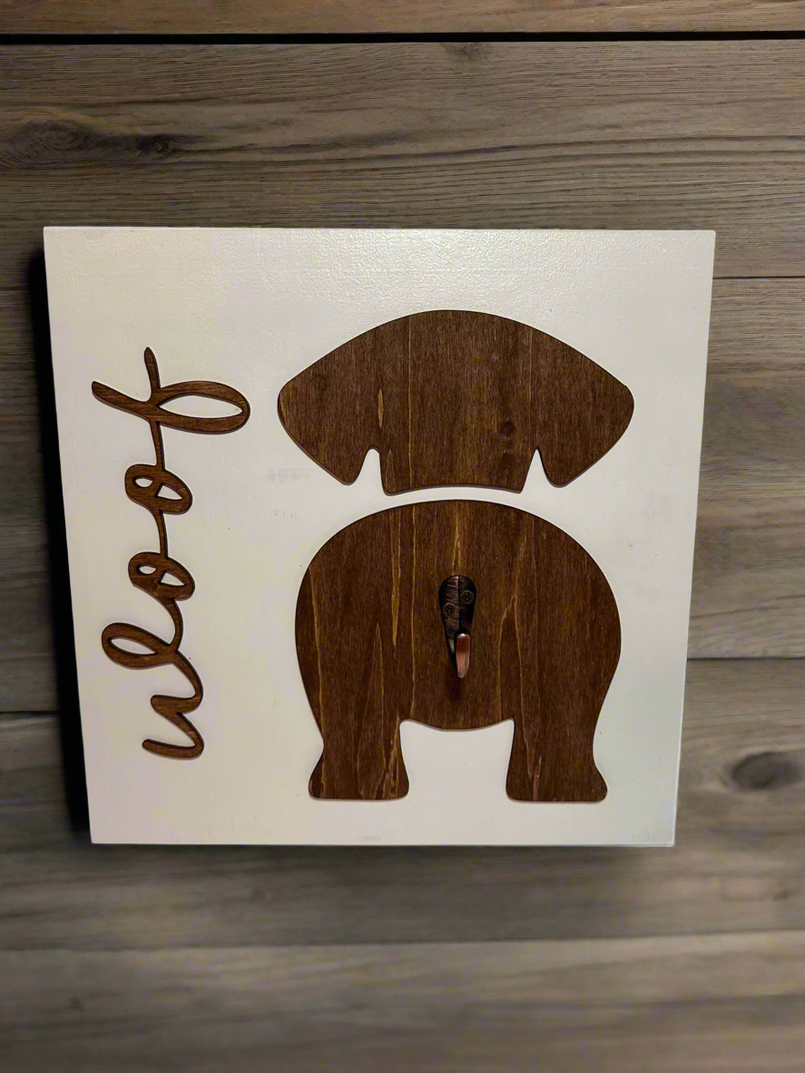 12x12 wall art that also serves as a dog leash hanger. The pup's tail is the ideal hook for leash storage.